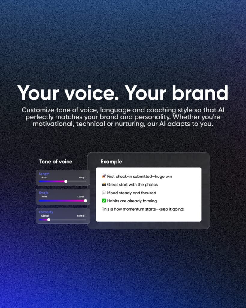 Customize the tone of voice, language and coaching style so the AI perfectly matches your brand and personality. Whether you’re motivational, technical, or nurturing, Check-Ins AI adapts to deliver feedback that sounds authentically you.